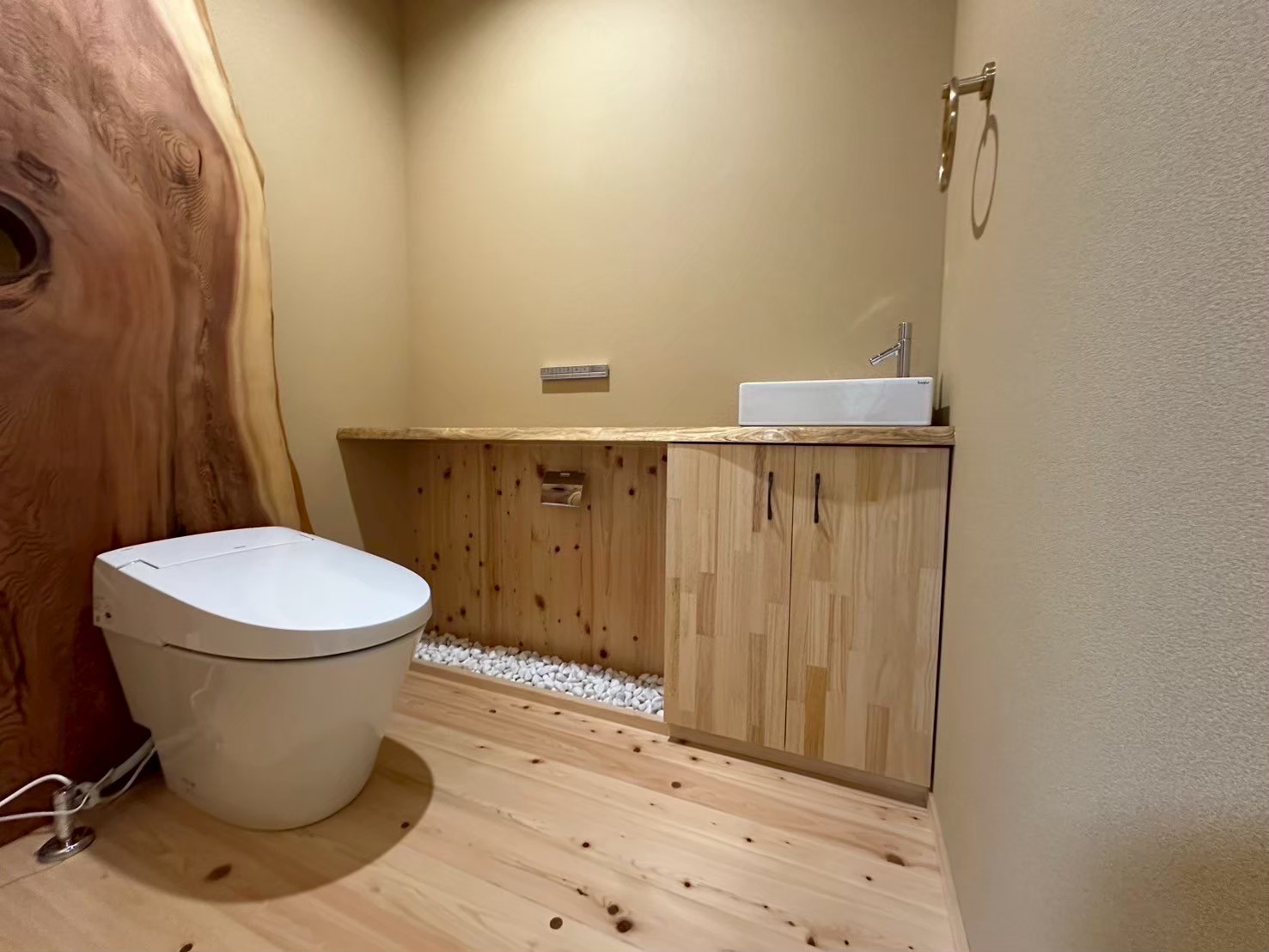 特にトイレ背面の一枚板のデザインウォールが印象的で、まるで自然の中にいるような落ち着きを与えてくれます。